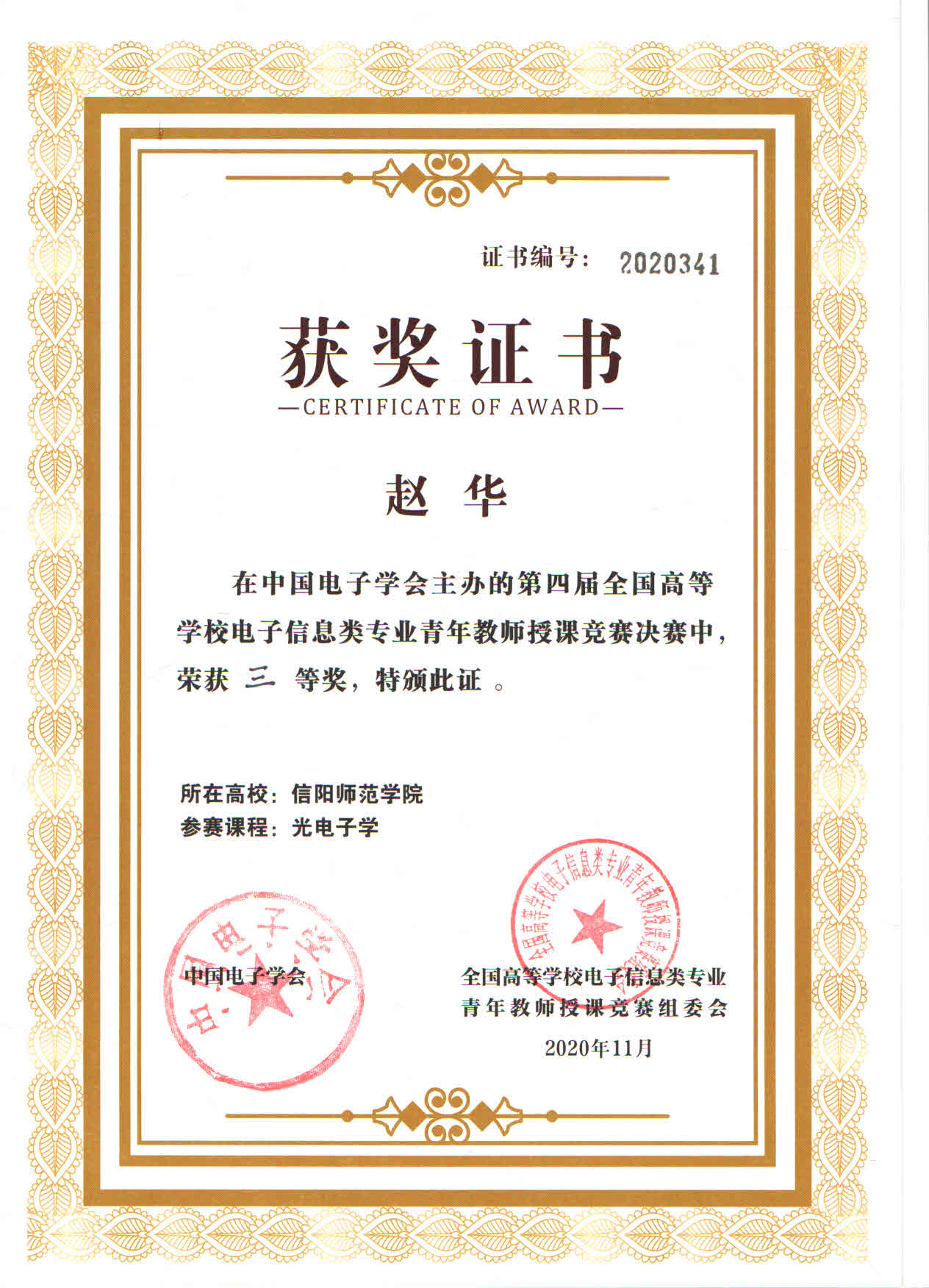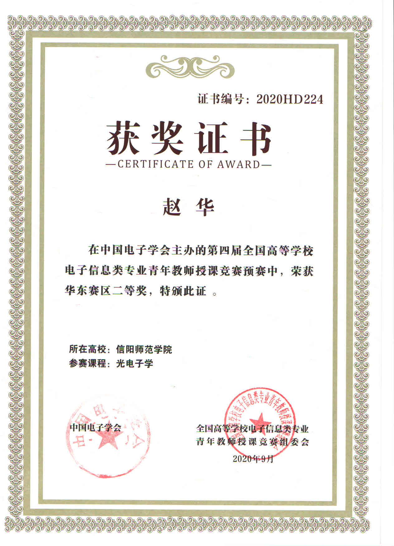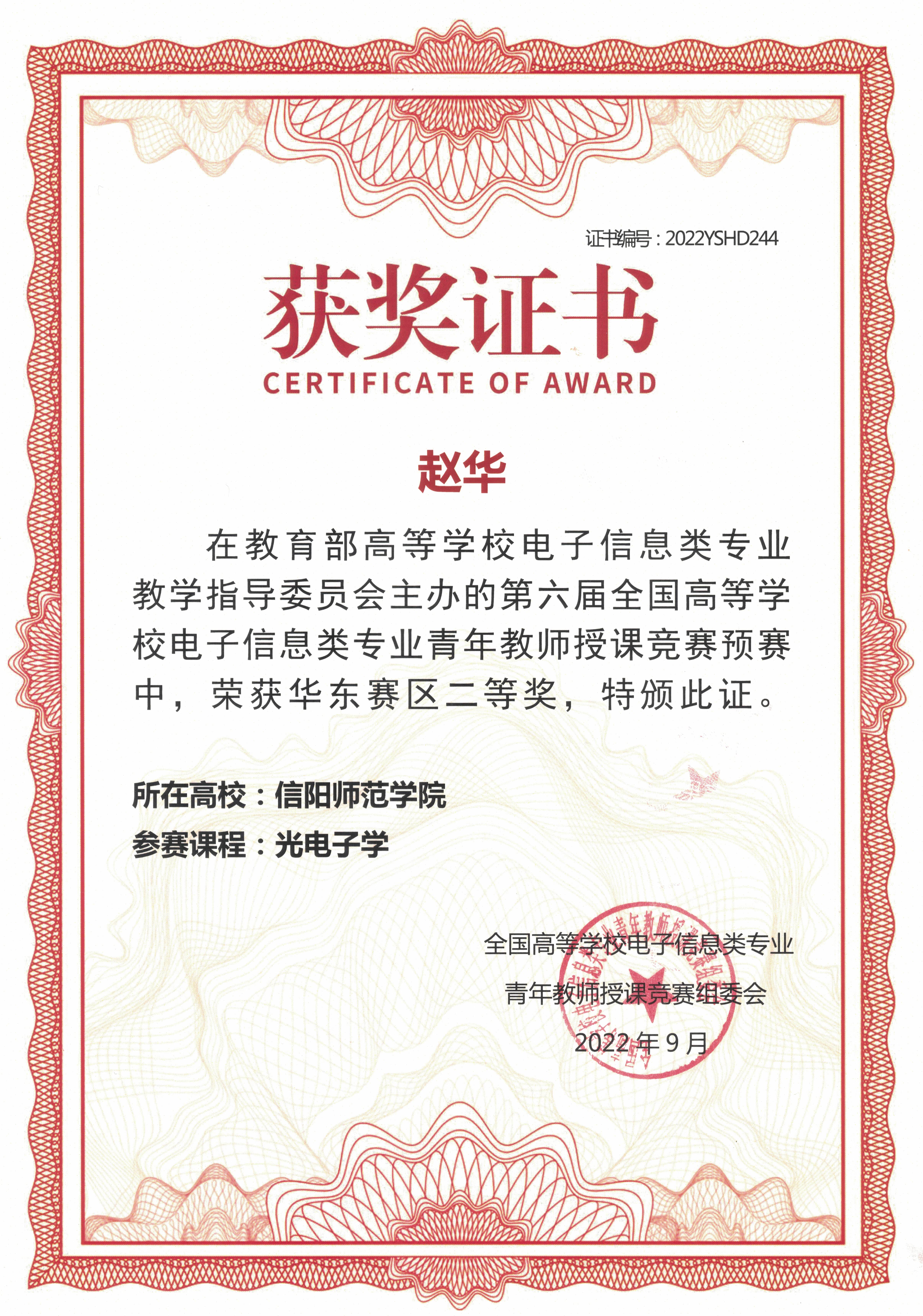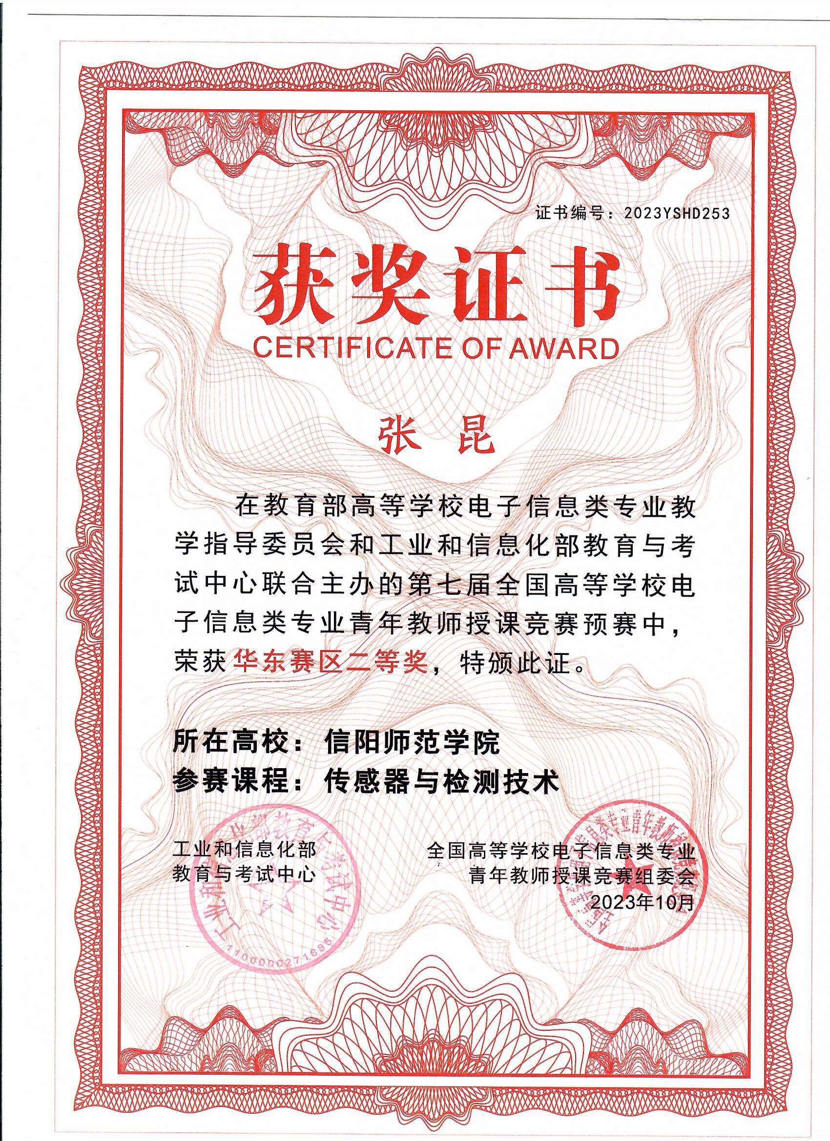 其它奖项 | 2022-全国高等学校电子信息类专业青年教师授课竞赛-华东赛区二等奖-赵华 2023-全国高等学校电子信息类专业青年教师授课竞赛-华东赛区二等奖-张昆 |