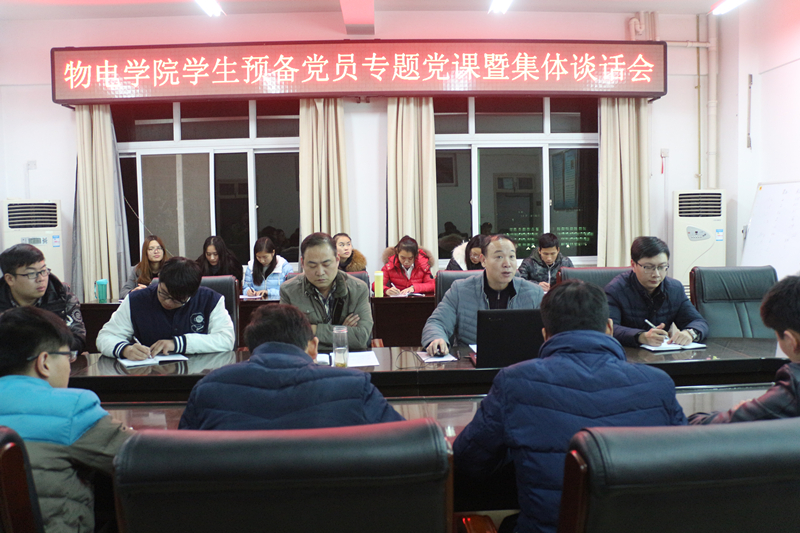 为增强学生党员党性意识,践行党的宗旨,发挥党员的先锋模范作用。12月12日,物电学院在理科楼911会议室召开学生预备党员专题党课暨集体谈话会。学院党委书记柳士刚、党委副书记李刚、党委秘书张康华及27名预备党员参加了会议。会议由党委副书记李刚主持。