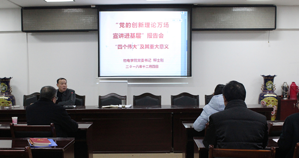 为引导广大党员深化学习习近平新时代中国特色社会主义思想,扎实推动党的创新理论成果深入人心,把党的十九大精神落到实处,12月4日,物电学院在理科楼511会议室举行“党的创新理论万场宣讲进基层”专题报告会,学院党委书记柳士刚为学院全体师生党员作了题目为《“四个伟大”及其重大意义》的专题报告。