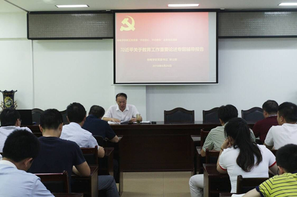 6月26日下午,学院党委书记柳士刚在理科楼511会议室为教工一支部、教工二支部党员做了习近平关于教育工作重要论述专题辅导报告。报告从七个方面对习近平关于教育工作重要论述进行了解读:1、教育本质:教育决定着人类未来;2、教育战略:坚定实施科教兴国战略,始终把教育摆在优先发展的战略地位;3、坚持办学正确政治方向;4、教育的根本任务:立德树人,学校要承担好立德树人、教书育人的神圣职责;5、教育理想:走自己的道路,牢记“四个服务”,发展具有中国特色、世界水平的现代教育;6、教师队伍保障:塑造灵魂,家国情怀;7、把提高人才培养质量作为工作重点。通过专题辅导报告,教工党员学习了新思想新观点新要求,深刻领会了我国教育改革发展的目标、方向和中国特色社会主义教育的本质和发展规律。促进教工党员努力做好现阶段教育改革发展的各项工作,为实现“两个一百年”奋斗目标和中华民族伟大复兴的中国梦作出应有贡献。