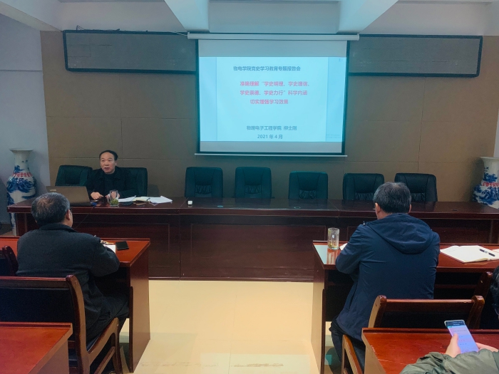 4月13日,物电学院在理科楼连廊402会议室开展党史学习教育专题报告会,报告会题目为《准确理解“学史明理、学史增信、学史崇德、学史力行”科学内涵,切实增强学习效果》,主讲人为学院党委书记柳士刚,学院全体教工党员参加了报告会。