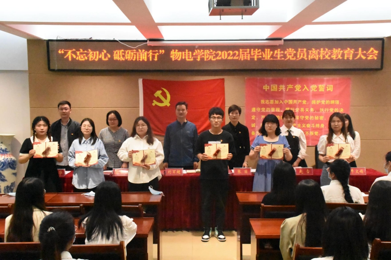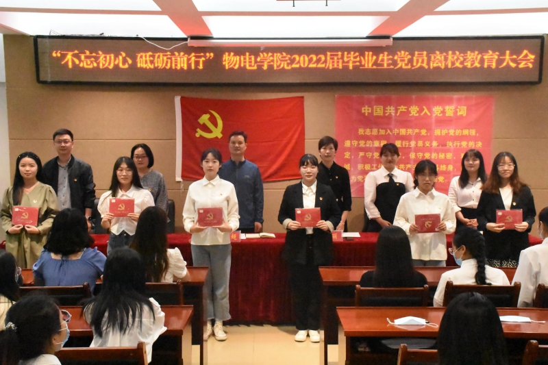 为做好我院2022届毕业生党员离校教育工作,5月18日,我院在理科楼连廊402会议室召开“不忘初心 砥砺前行”物电学院2022届毕业生党员离校教育大会。学院党委书记刘百超、副书记张丽、学生党支部书记和毕业生党员代表参加了会议。会议由张丽主持。