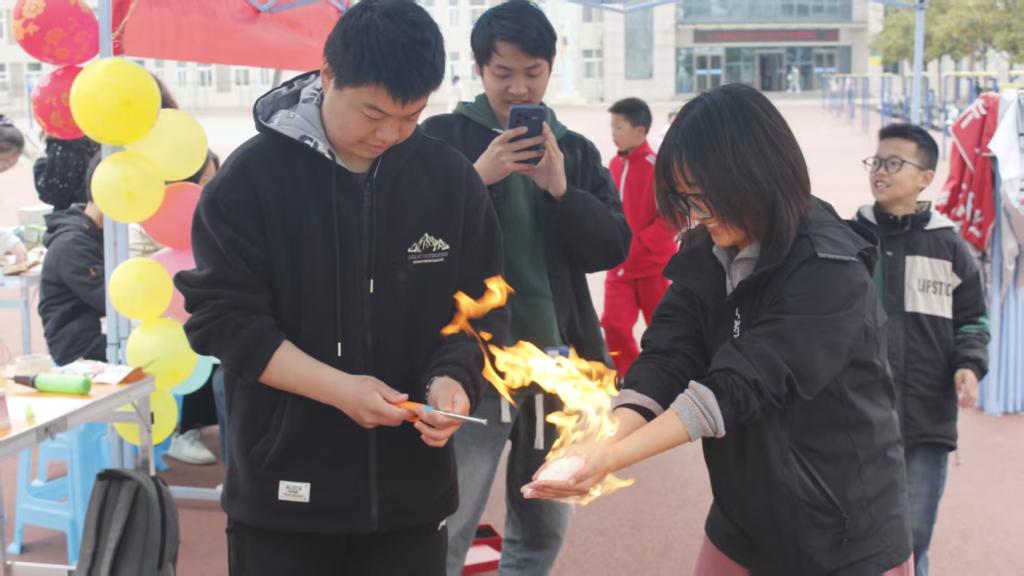 活动现场设置了“火焰掌”、“旋转小风扇”、“纸杯叠叠乐”等十余项趣味项目,将物理现象解码为心灵成长密码。通过“火焰掌”项目,让学生在掌心跃动的蓝色火焰里体验“掌控风险”的勇气;“纸杯叠叠乐”项目结合结构力学知识,要求参与者在限定时间内搭建抗震高塔,悄然训练焦虑情境下的专注力;“蛟龙取水”项目通过蒙眼接力传递液氮罐,考验非语言沟通中的信任建立。