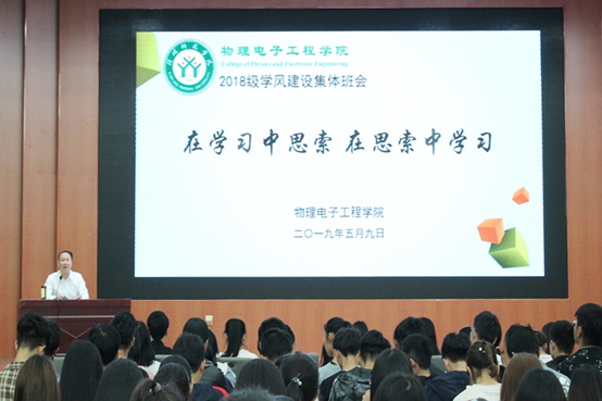 为进一步加强学风建设,提高学子学习积极性, 5月9日晚,我院于逸夫楼多功能厅成功召开“在学习中思索,在思索中学习”学风建设主题班会。我院党委书记柳士刚,2018级辅导员张康华、黄钰莹、赵雪与2018级全体学子共同参与主题班会。会议由黄钰莹主持。