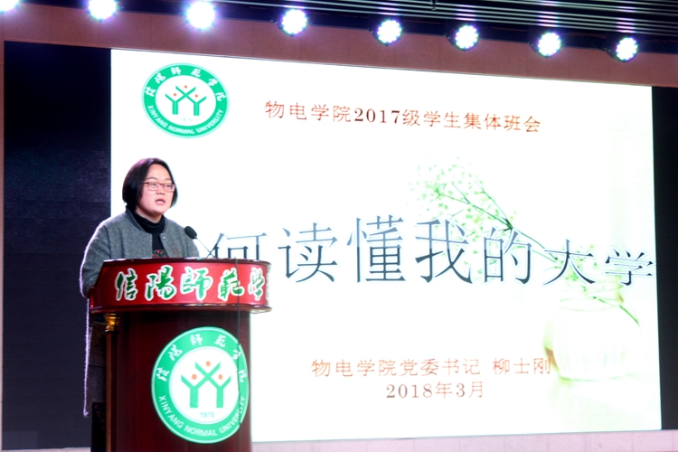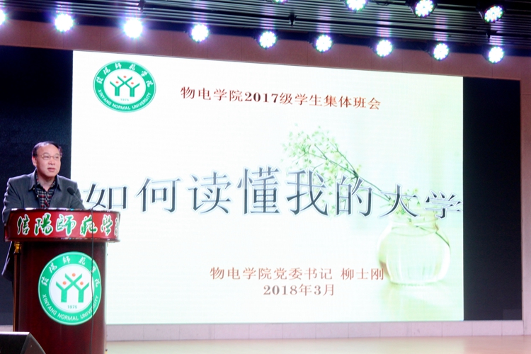 此次报告会以集体班会的形式召开。柳士刚以“如何读懂我的大学”为主题,分别从“态度决定一切”、“坚持知行合一,重在做,在认真的做实做细上下功夫”、“高度重视刻苦学习”、“良好的思想素质是关键和保证”四个方面为现场学子带来一节意义深远的主题班会。第一个层面,柳士刚结合大学生实际生活现状,提出“是否了解如何真正地适应大学生活”和“对自己的大学安排是否思路清晰、目标明确”两个问题,引发学子们思考,他阐述了“态度”在学习生活中的深刻含义,希望学生们能端正态度、清晰思路、明确目标,不断加强学习、锻炼能力,提高自身的综合素质。第二个层面,柳书记结合自身求学经历,指出刻苦学习的重要性,强调只有将“知”与“行”统一起来,脚踏实地、勤奋努力,才能取得良好成绩。第三个层面,柳书记简要解读《信阳师范学院学业预警管理办法》(信院字[2017]204号),鼓励有挂科现象的学生端正学习态度,勤奋学习、坚定信心,在今后的学习中取得满意成绩。良好的思想素质是大学生的学习生活指南,最后,他寄语广大青年学子要严于律己、积极向上、自强不息,有信心和毅力,将理想付诸行动,提高思想素质,为今后的学业与就业打下基础。