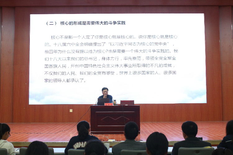 为深入学习宣传贯彻党的十九大精神,把思想和行动统一到党的十九大精神上来,立足新时代,积极新作为,展示新风采,凝心聚力为学校建设高水平师范大学贡献力量,党委宣传部、学工部、团委、马克思主义学院在全校学生中开展学习宣传贯彻党的十九大精神系列活动。11月13日晚,马克思主义学院副院长程晋富教授在逸夫楼报告厅作了一场题为“坚定理想信念,坚守对党的忠诚”的专题报告。学生处副处长陈铭,数学与统计学院党委副书记洪亮,团学老师陈兴海、张艺成,我院党委秘书张康华,团委老师黄钰莹,与来自数学学院、物电学院共500名学生参加此次报告会,报告会由洪亮主持。