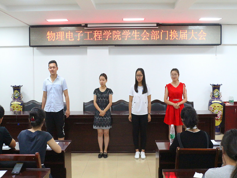 6月4日下午,物电学院学生会部门换届大会于理科楼511会议室顺利进行,我院党委秘书张康华,团委老师杨勇、黄钰莹等领导老师莅临现场,与学生会主席团成员及各部门部长、副部长一同参加会议并担任评委。