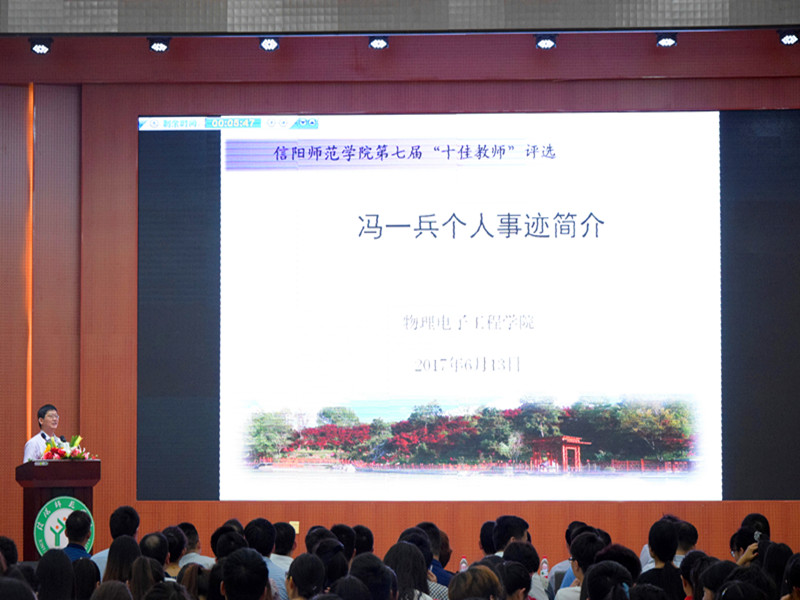 经过教师自行提交申请,院方推荐和学校初审,共十八名优秀教师脱颖而出,成功入围决赛。决赛现场,我院教师冯一兵结合自身多年的科研教学经验,围绕学习、工作和个人成就等多方面展开论述,凭借精心制作的ppt向在场师生简要介绍了个人情况,并以国培计划、学生社团为例汇报了多年来在教学、科研等方面的成绩。在个人成就方面,曾获得河南省教育系统教学技能竞赛二等奖,中国物理学科普工作委员会科普活动优秀个人奖等多项荣誉。会后,经现场投票和网络投票,我院冯一兵凭借其渊博的学识、广阔的专业视野成功获得本届最受学生欢迎的“十佳教师”称号。