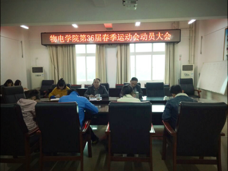 4月11晚,物电学院于理科楼911会议室开展第36届春季运动会动员大会,我院党委书记柳士刚,副书记李刚,院团委老师黄钰莹,学生会主席团成员及相关部门部长参加此次会议。会议由李刚主持。