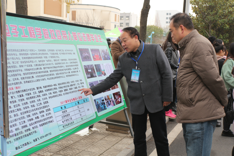 12月10日上午,“河南省毕业生就业市场豫南分市场2017届毕业生冬季就业双选会”在我校举行。我院就业领导小组组长、党委书记柳士刚,就业领导小组副组长、党委副书记李刚,就业秘书、辅导员张彦飞、黄钰莹带领我院毕业生到达双选会会场,积极与用人单位接洽,推荐我院毕业生就业。