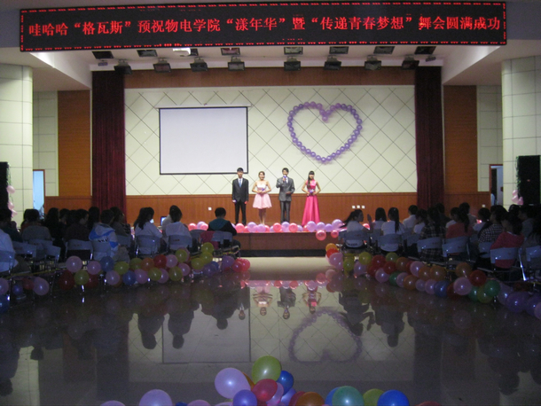 我院团总支学生会文艺部于4月14号晚7:00在逸夫楼报告厅隆重举行“漾年华”暨“传递青春梦想”狂欢之夜舞会。我院团总支书记刘华超老师参加了本次舞会,还有来自十八个院系的文艺部部长以及我院学生会各部部长和副部长。