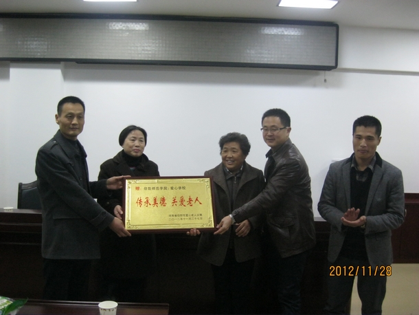 11月28日下午,我院接受了来自信阳市爱心老人公寓的感谢牌匾,并在理科楼510会议室举行了简单而隆重的接匾仪式。我院党总支副书记苗天峰、我校团委董银银老师、信阳市爱心老人公寓负责人李冬珍、刘雪梅、我院团总支老师刘华超出席了仪式,来自爱心学校的同学们参加了此次活动。