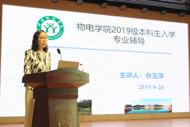 仓玉萍为学子们作专业介绍与学业指导。她结合精心制作的PPT向在场学子简要介绍我院的发展历史和基本概况,并从人才培养方案、课外实践、考研情况等方面展开详细阐述,条理分明的文案展示和真实准确的数据统计,充分展现了我院先进的的实验室条件、雄厚的师资力量与优良的学风建设。(物电学院 黄钰莹 王梦媛/供稿 张天池 原彩毓/供图)