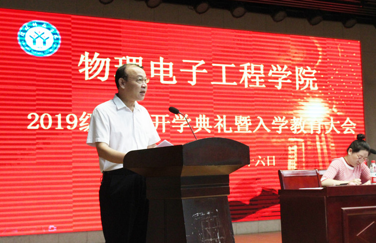 会议伊始,全体起立,奏唱国歌。柳士刚发表重要讲话。他代表我院领导老师对新生的到来表示热烈欢迎,并对其军训取得的优异成绩表示充分肯定。对于新生如何规划大学生活,柳士刚从志存高远、树立远大理想,热爱学校、热爱专业,调整好状态、高度重视学习,培养多种能力、提高综合素质,新起点、新目标、新面貌五个方面对学子提出要求,希望在场学子始终坚持秉承“厚德崇实,善学敏行”的校训,将个人愿望与家长期望、国家希望紧密结合,强化自身责任感、使命感和担当意识,努力成为追求卓越、开拓进取的新时代青年学子。柳士刚表示,大学是成长成才的地方,希望学子们树立远大理想,规划大学蓝图,切实做到在学中悟,在悟中行,执青春之笔,书写奋斗路上的华丽篇章。随后,2017级应用物理班张宇权、2019级新能源科学与工程班薛颖珊分别代表老生、新生发言。
