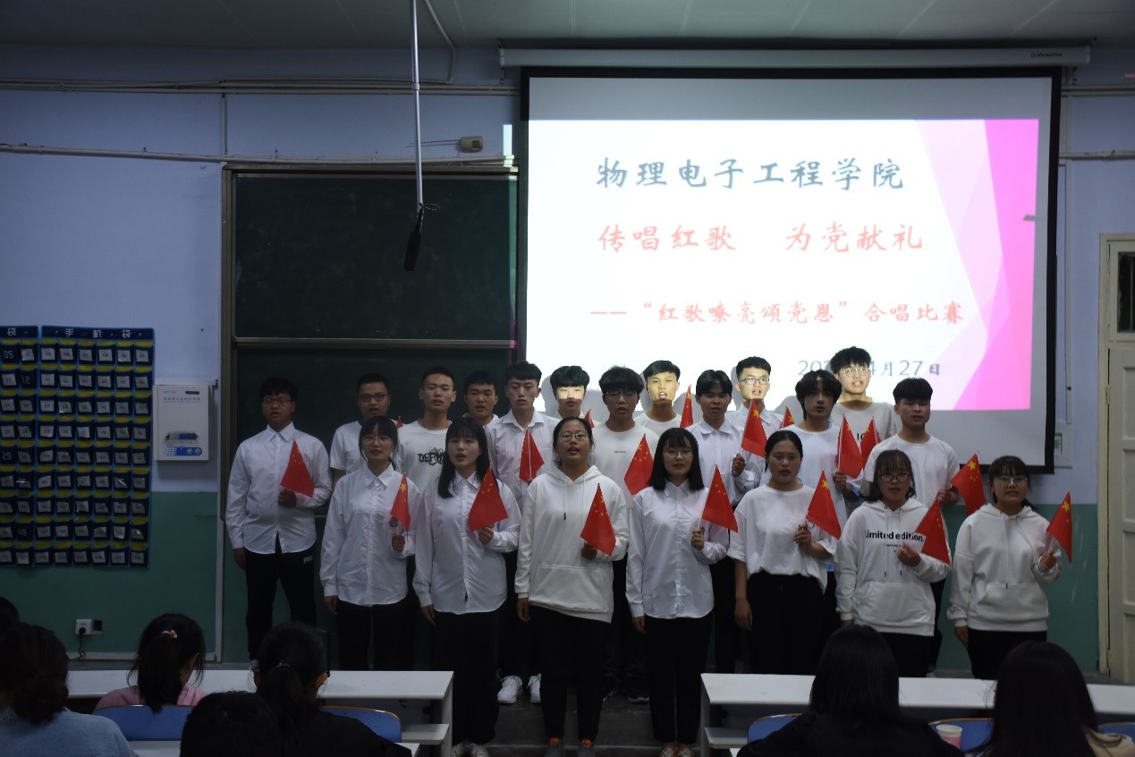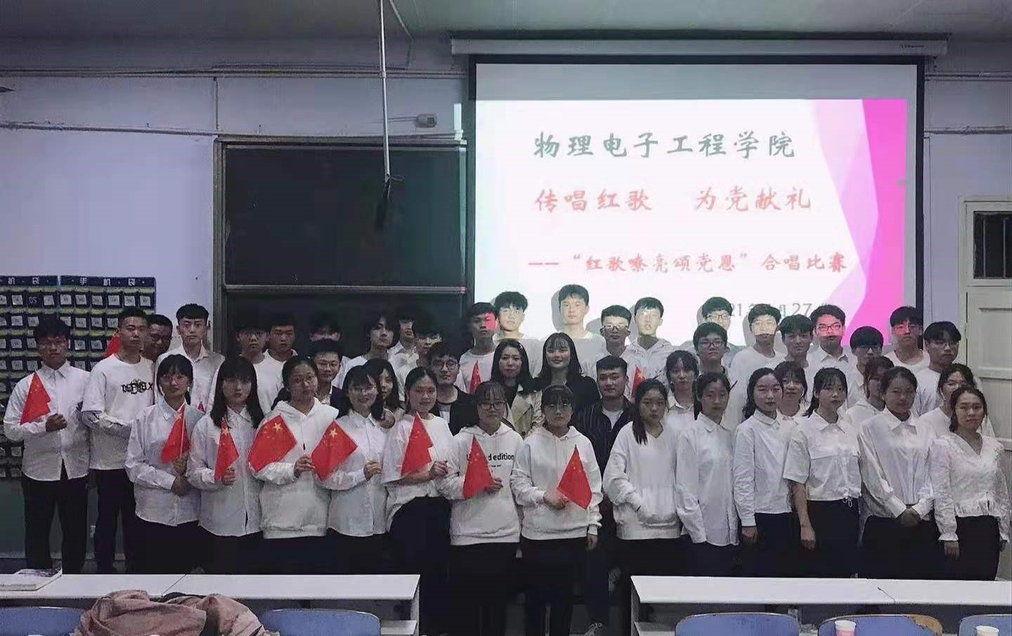 弘扬民族文化,传唱红色金曲,激发爱国热情,展现物电风采。为庆祝建党100周年,我院于2021年4月27日晚6:30在教二T1举行“传唱红歌 为党献礼”——红歌嘹亮颂党恩合唱比赛。文学院团委老师柳家琪,专职辅导员陈辉,旅游学院团委老师赵子鉴,数学与统计学院专职辅导员杨帆,化学化工学院专职辅导员严赫,物电学院团委老师牛文娟参加此次活动,并担任此次比赛评委。此次合唱比赛充分展示了我院学生对党、对祖国最真挚的爱,也展现我院学子饱满的精神面貌。