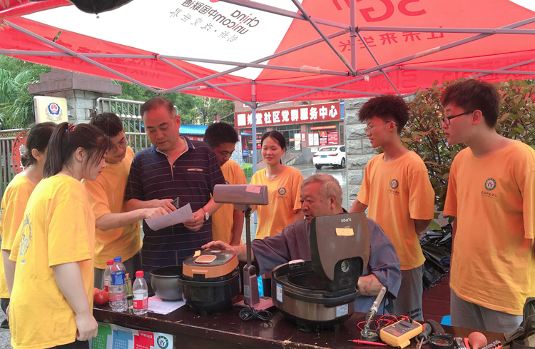 在疫情防控常态化的形势下,tyc41183太阳成集团按照学校“三下乡”暑期社会实践工作通知要求,以“学党史悟思想 我为群众办实事”为主题,组建大学生社会实践服务队于2021年7月5日至7日走进信阳市浉河区金牛山街飨堂社区开展义务家电维修、电力安全进家庭科普宣传等服务活动。