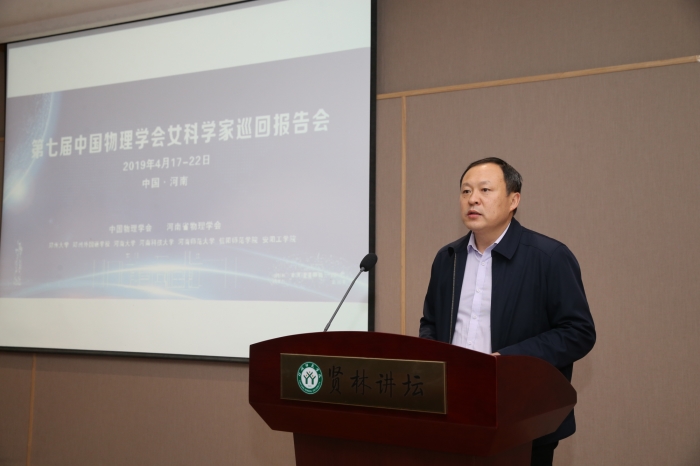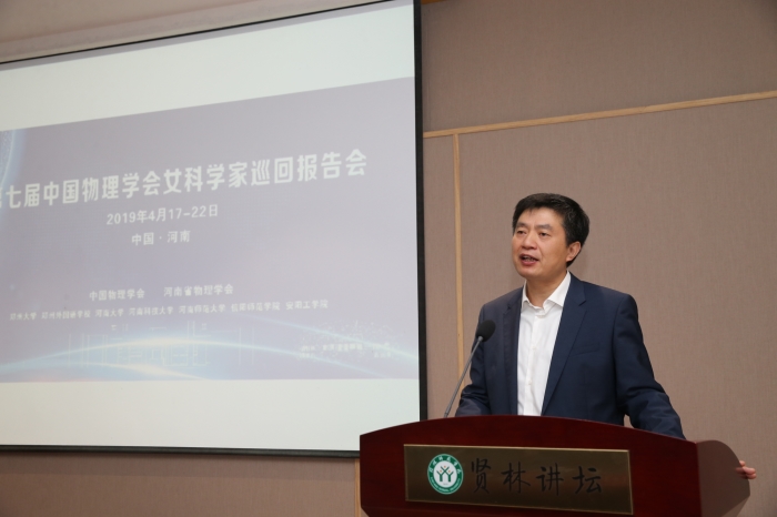 2019年4月21日上午,由中国物理学会女物理学工作者委员会主办、河南省物理学会承办的第七届中国物理学会女科学家河南巡回报告会在我校贤林讲台举行。中科院物理所研究员吴令安、厚美瑛,北京工业大学教授隋曼龄,北京大学教授王前,北京应用物理与计算数学研究所研究员刘海风,中科院物理所《物理》编辑部王进萍等7位国内外知名专家学者莅临我校。副校长余本海教授出席活动并致欢迎辞,报告会由tyc41183太阳成集团院长涂友超教授主持。物电学院青年教师、研究生以及本科生共200余人参与了此次活动。