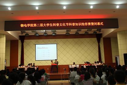 本届大学生科普文化节历时近两个月,在此期间,物电学院成功开展了科普知识专题讲座、科普知识抢答赛、“科技之光”影视欣赏、科普知识展、天文观测和电子设计竞赛等系列活动,这些活动形式新颖、内容丰富、涵盖面广,各项活动以科学知识、文化内涵和科技创新为主,集知识性、娱乐性、趣味性、人文性于一体,在全校掀起了一场学习科学文化知识的热潮。本届文化节激发了学生获取科学知识的渴望,营造了良好的校园科技文化氛围。(物电学院祁瑞娟 文亚倩供稿,指导老师 冯一兵)