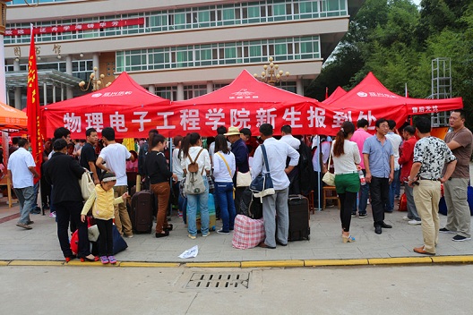 为使迎新接待工作顺利进行,我院提前做出了准备。在迎新期间,我院秉承“全心全意为新生服务”的宗旨,热情大方、认真细致的工作态度,为新生营造热烈、有序、温馨的入学氛围。校图书馆前,工作人员认真办理各项报到手续,仔细进行新生入学资格审查并带领新生办理入学手续。我院领导、老师也亲临迎新现场为新生及家长解疑答惑。大二、大三学生组成志愿者团队帮助新生提行李,讲解校园情况,使之更快更好地融入到大学生活中。为保证每一位家庭困难学生顺利入学,信阳师范学院本着“以人为本”的办学宗旨,在图书馆前新生报到处设立绿色通道咨询点,为贫困学生排忧解难。“绿色通道”作为新生入学的首要资助方式,为学生打开了一扇绿色的大门。
