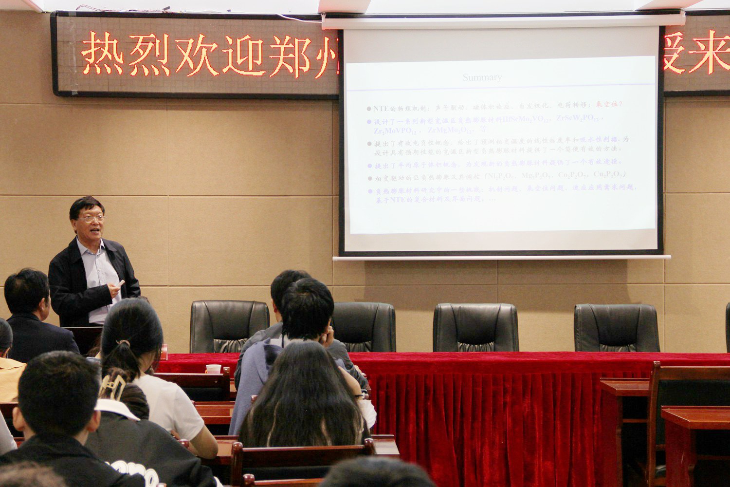 5月12日,应学院邀请,郑州大学梁二军教授来我院讲学,在理科楼会议室作了题为“负热膨胀材料研究现状、挑战与机遇”的学术报告。学院教师、研究生及本科生聆听了报告。报告会由副院长龚克主持。