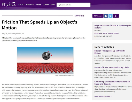 近日,我院青年教师葛力新博士在《Physical Review B》上发表题为“Negative vacuum friction in terahertz gain systems”的研究论文,并被美国物理学会(APS)旗下的物理杂志特别报道(Featured in Physics)。